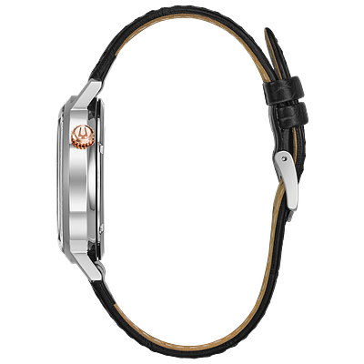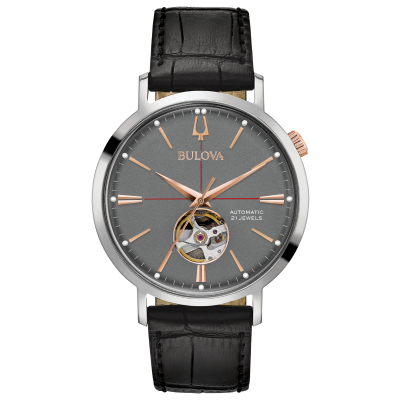 Reloj Bulova colección Aerojet para Caballero.Movimiento mecánico de cuerda automática de 3 manecillas.Reserva de marcha de 40 horas.Caja realizada en acero inoxidable. Carátula gris con apertura, indicadores y manecillas en oro rosa. Corona en posicioón de las 2hrs. Tapa trasera transparente atornillable. Cristal mineral. Correa de piel negra con broche tipo hebilla de tres piezas. Resistencia al agua de hasta 30 metros.
