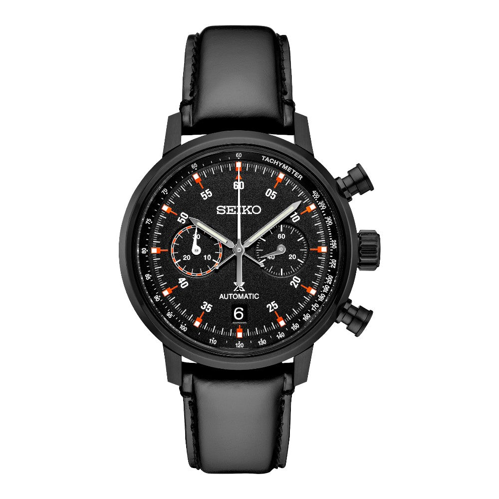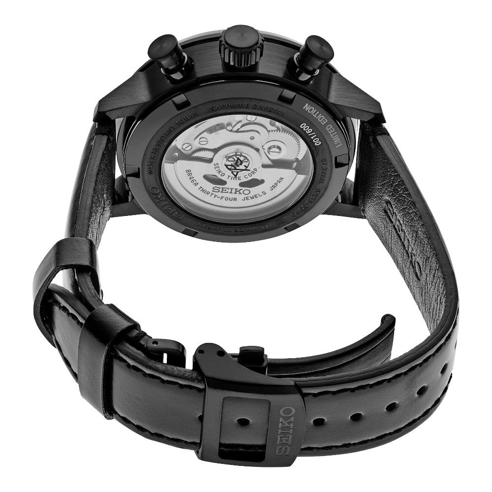 Cronógrafo Mecánico Prospex Speedtimer Edición Limitada. Diseñado para quienes viven la vida como una aventura, la línea Seiko Prospex supera cualquier desafío con excelencia tecnológica y estilo. Celebrando los primeros cronógrafos de precisión de Seiko, desarrollados para competiciones deportivas internacionales en 1964, así como la introducción en 1969 del primer cronógrafo automático del mundo, este distintivo reloj, disponible solo en una producción limitada de 600 unidades con el número de serie grabado en cada fondo de caja, ofrece una medición de cronógrafo de hasta 30 minutos de tiempo transcurrido en incrementos de 1/8 de segundo. Visible a través del fondo de caja transparente y atornillado, el movimiento automático de 34 rubíes late a una frecuencia de 28.800 alternancias por hora, con una reserva de marcha de aproximadamente 45 horas y capacidad de cuerda manual. Enmarcada por un anillo taquimétrico, la esfera negra mate reduce el reflejo de la luz a la vez que realza la visibilidad de los índices rojos y los detalles del contador de minutos del cronógrafo. El movimiento patentado 8R46 incluye una rueda de pilares y un mecanismo de embrague vertical que permite un movimiento suave y sin tirones de la manecilla del cronógrafo, a la vez que proporciona mayor durabilidad y eficiencia, y mejora el mantenimiento de la reserva de marcha durante el funcionamiento del cronógrafo. Fabricado en acero inoxidable con revestimiento endurecido negro, con pulsadores y corona especialmente diseñados para facilitar su uso, cierre de botón triple y cristal de zafiro de doble curvatura con revestimiento antirreflectante en la superficie interior. La correa de piel de becerro negra presenta costuras revestidas en el interior para protegerla del desgaste causado por la transpiración durante la actividad deportiva intensa. Presentado en una caja de coleccionista de edición limitada. Resistente al agua hasta 10 bar y 100 m.